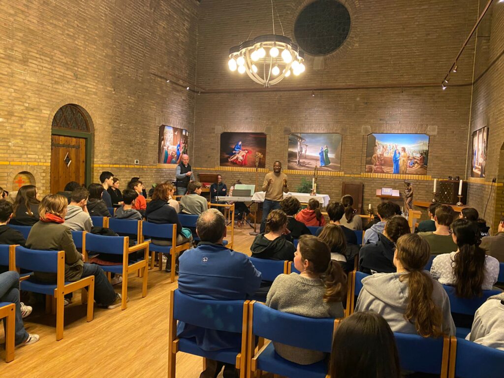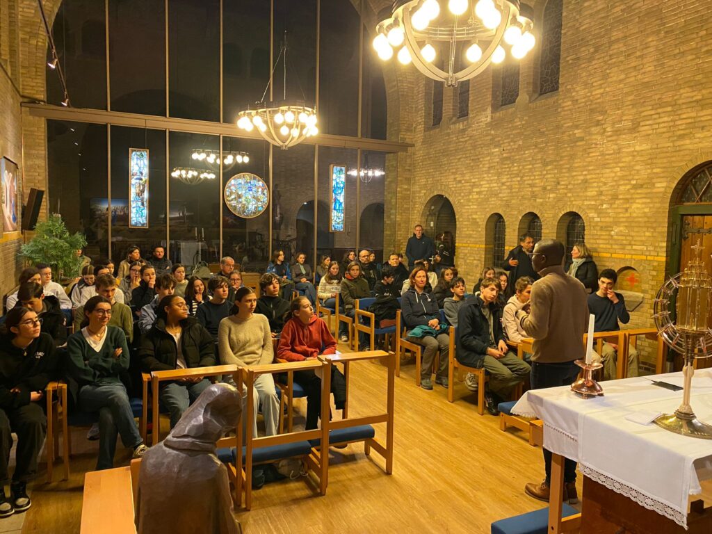 Nous, les jeunes de l’aumônerie de la 4e à la Terminale, nous retrouvons une soirée par mois chez nos animateurs, après une messe “entre nous”, Chapelle Notre-Dame de Lourdes (Lourdes Kapel), Berkenbosch Blokstraat 9A, 2586 HD Den Haag (Scheveningen) le samedi à 18h.